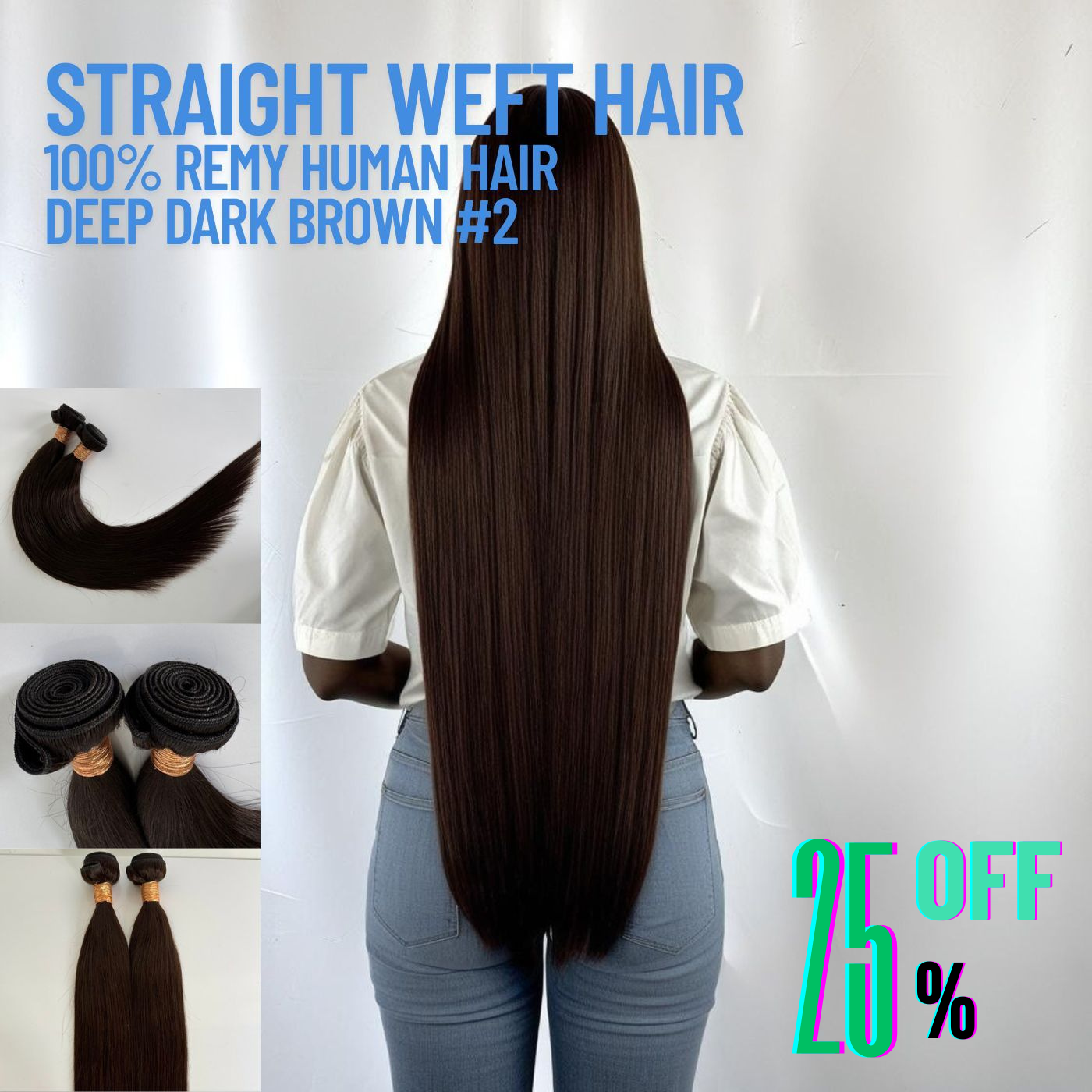 Extensions de cheveux trame brun foncé profond n° 2 – 100 % cheveux humains Remy | Paquet de 100 g | 10 à 30 pouces | Réutilisables | Expédié depuis le Canada