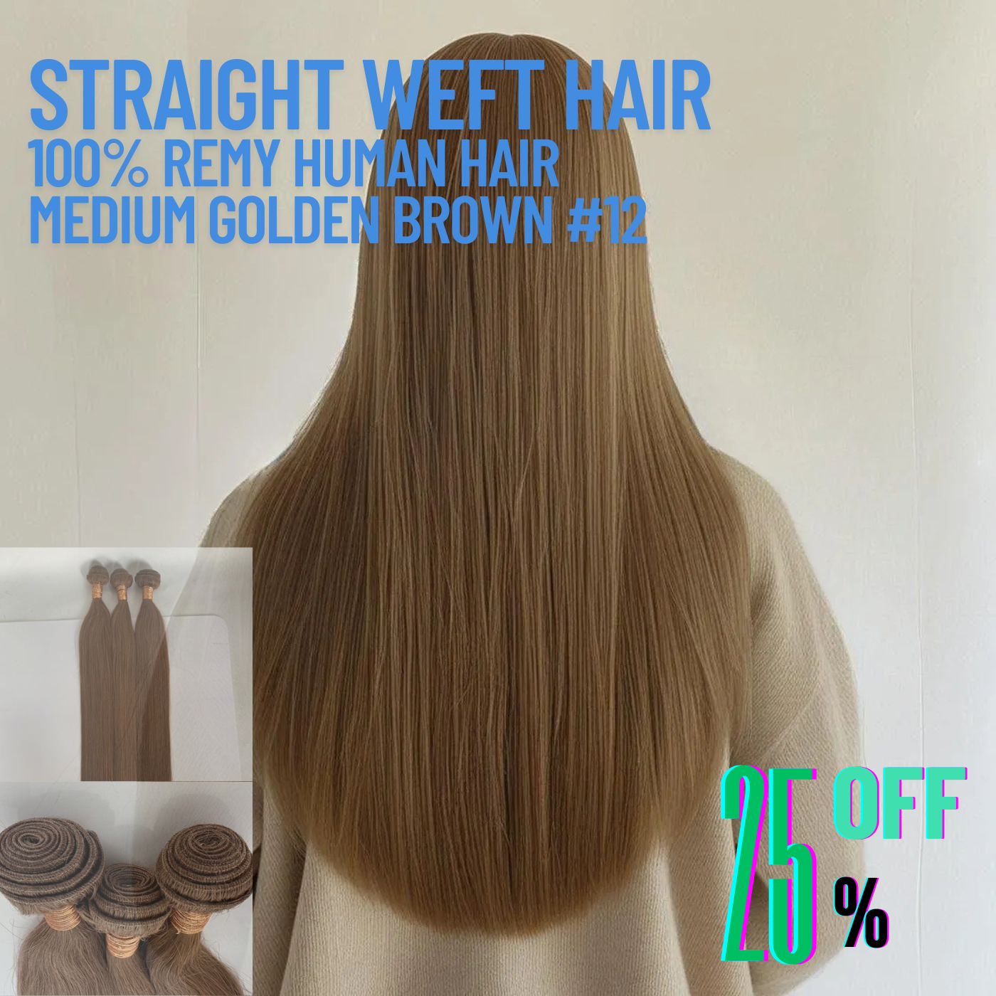 Extensions de cheveux trame châtain moyen doré n° 12 – 100 % cheveux humains Remy | Paquet de 100 g | 25,4 à 76,2 cm | Réutilisables | Expédié depuis le Canada