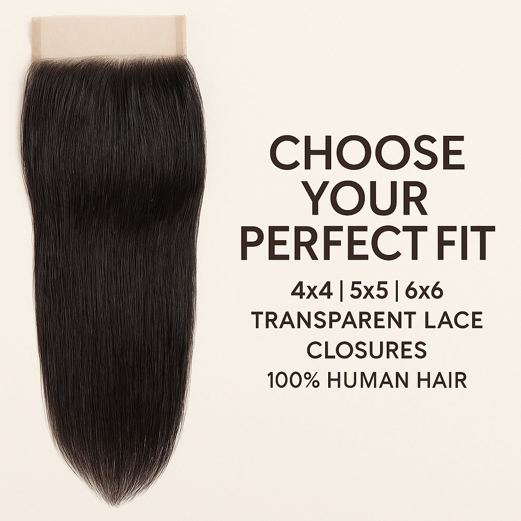 Natural Black #1B Transparent Lace Closure – 100% Remy Human Hair, soft, sleek, and breathable. Available in 4x4, 5x5, and 6x6 lace sizes, our straight closures blend seamlessly with your scalp and bundles for a flawless, natural finish.
