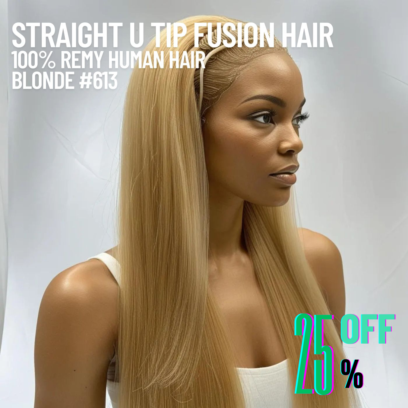 Blonde #613 U Tip Fusion Hair Extensions – 100% Remy Human Hair, soft, sleek, and long-lasting. Our #613 Straight U Tip extensions offer a secure, natural look that's ideal for salon-quality transformations.